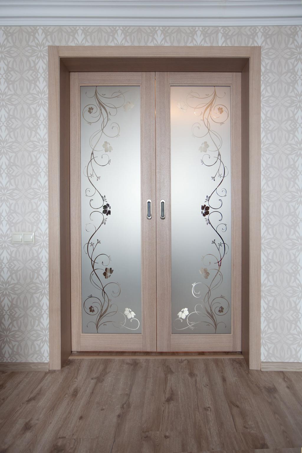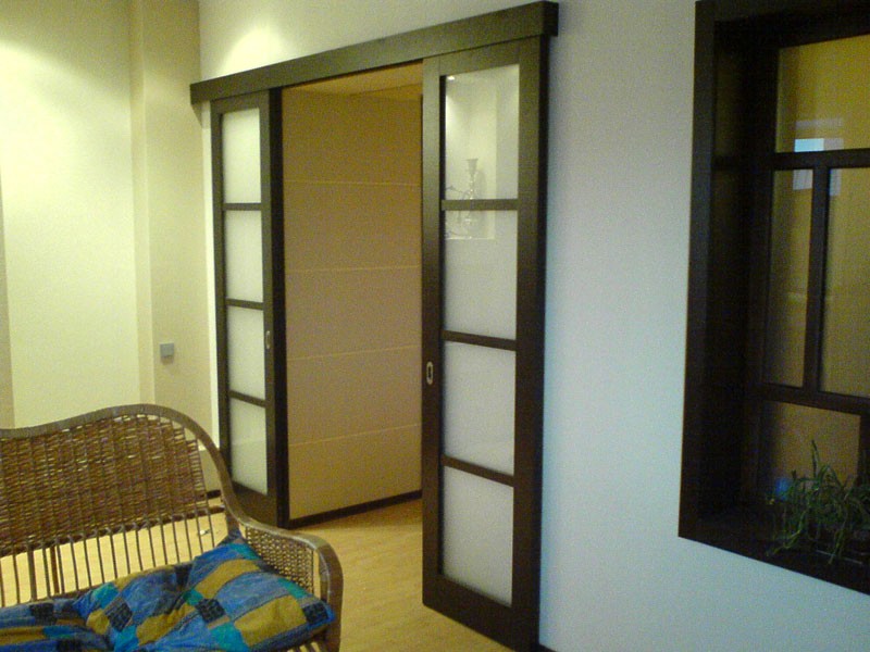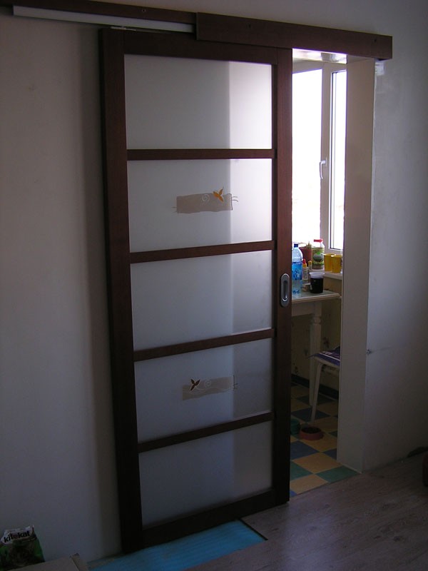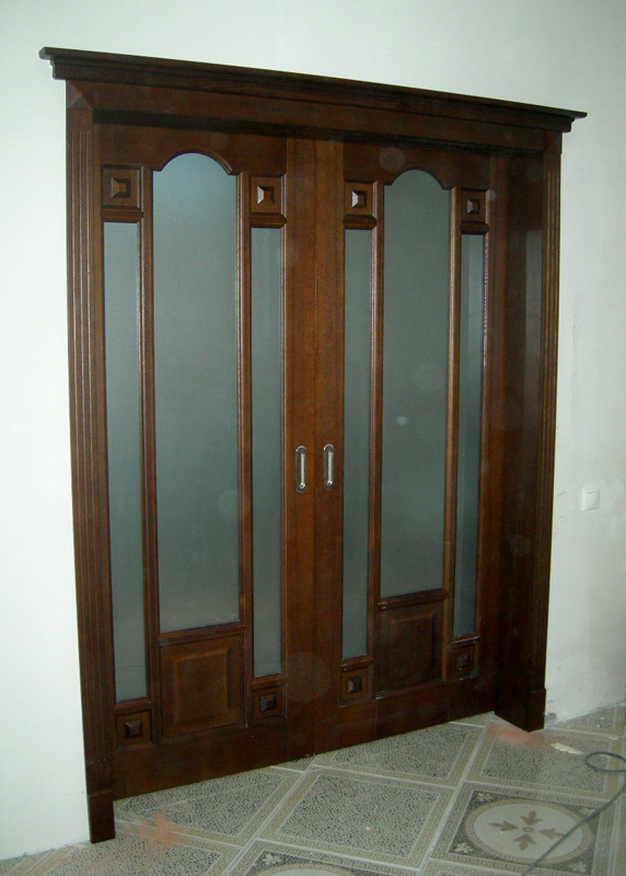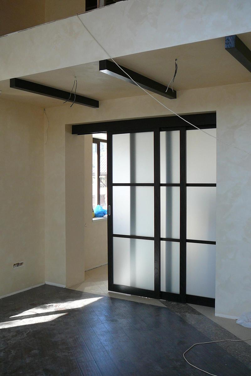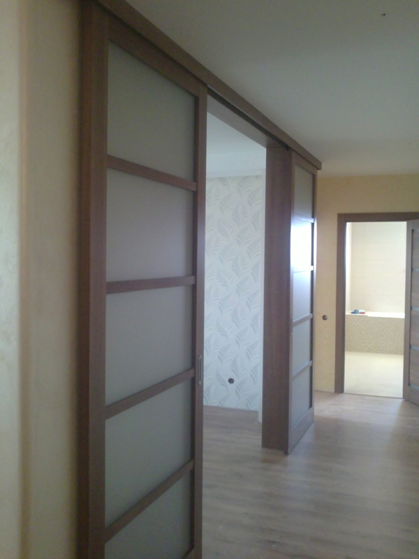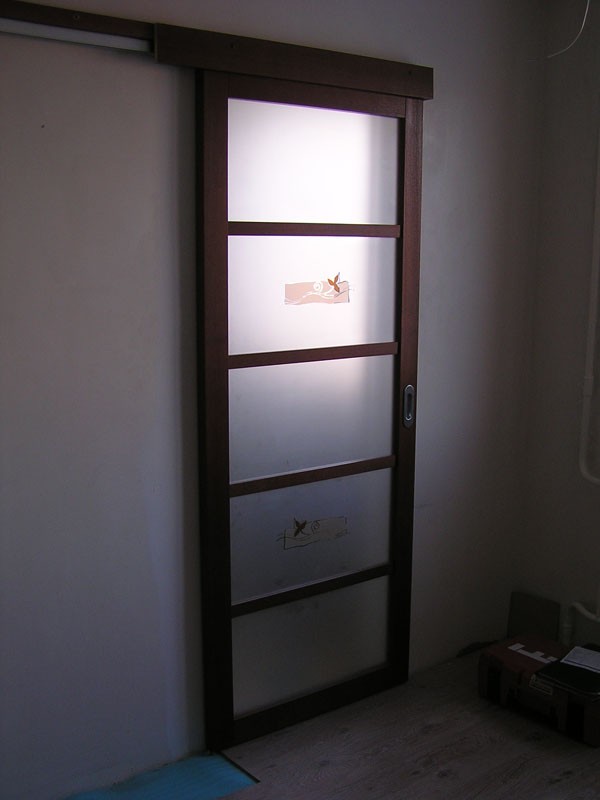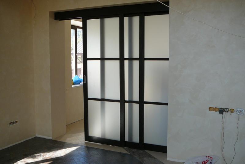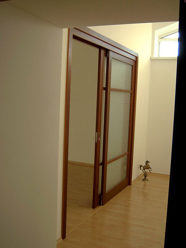 При изготовлении межкомнатных перегородок очень часто используются дверные рамы в виде полотна со стеклянными вставками, которые могут быть как цельными, так и выполненными в виде отдельных элементов, образующих определённую композицию. В качестве материала для деревянных рам чаще всего используются дуб, бук и шпонированная сосна с определённой цветовой тонировкой. В оформлении используется ярко выраженная древесная фактура, а в последнее время особенно популярными стали перегородки в японском стиле.
