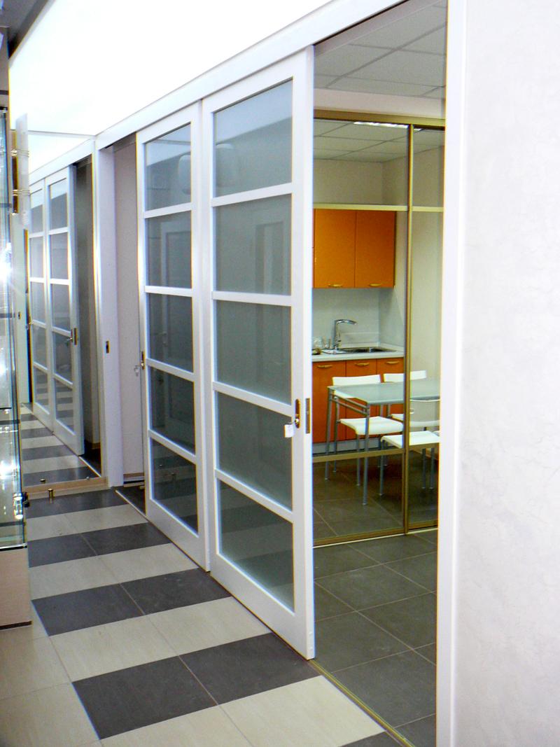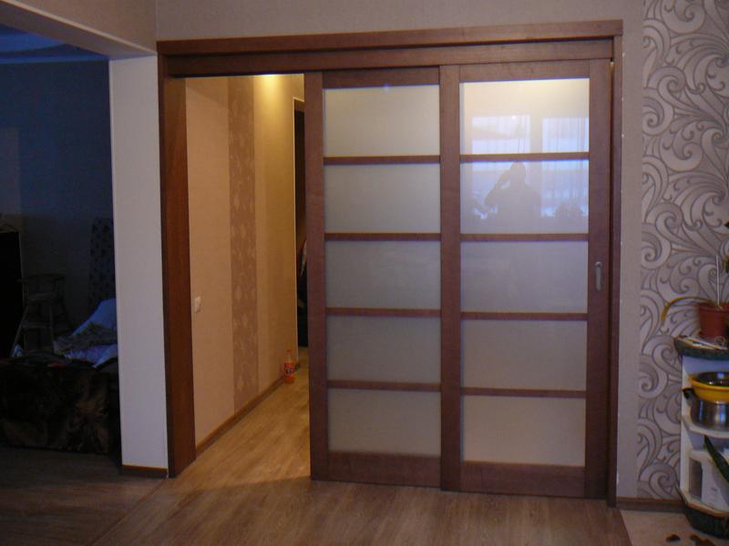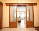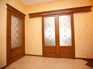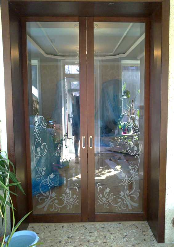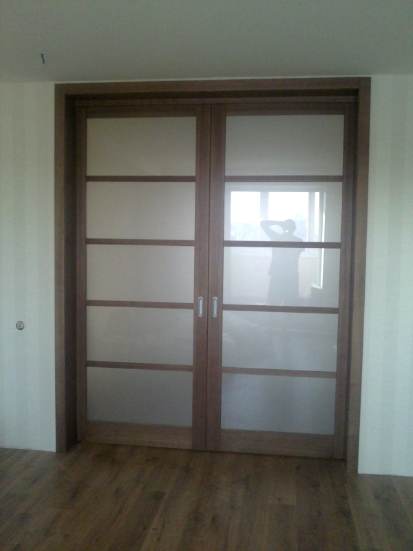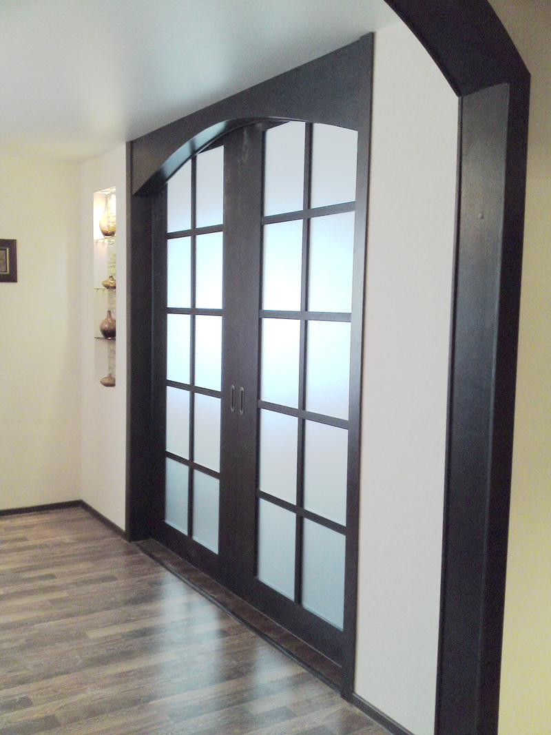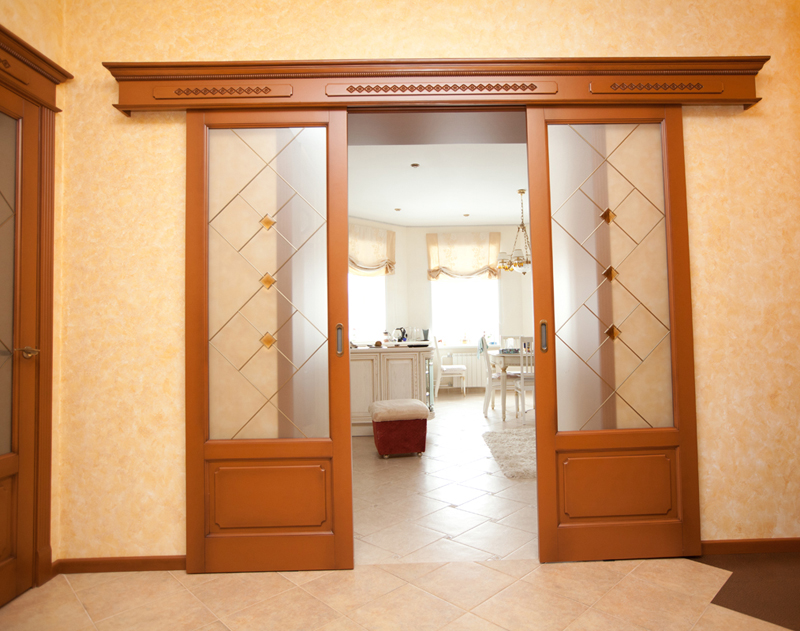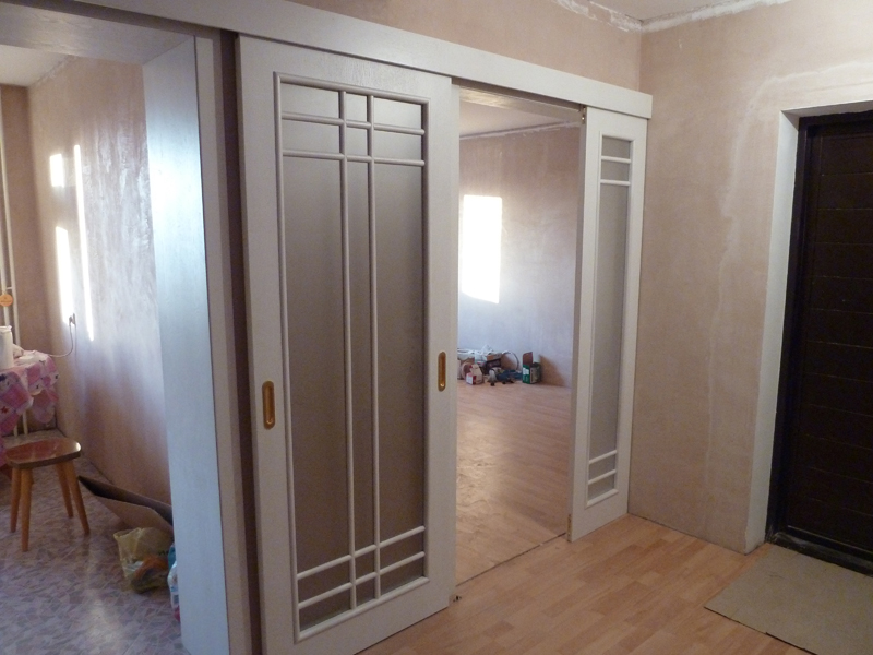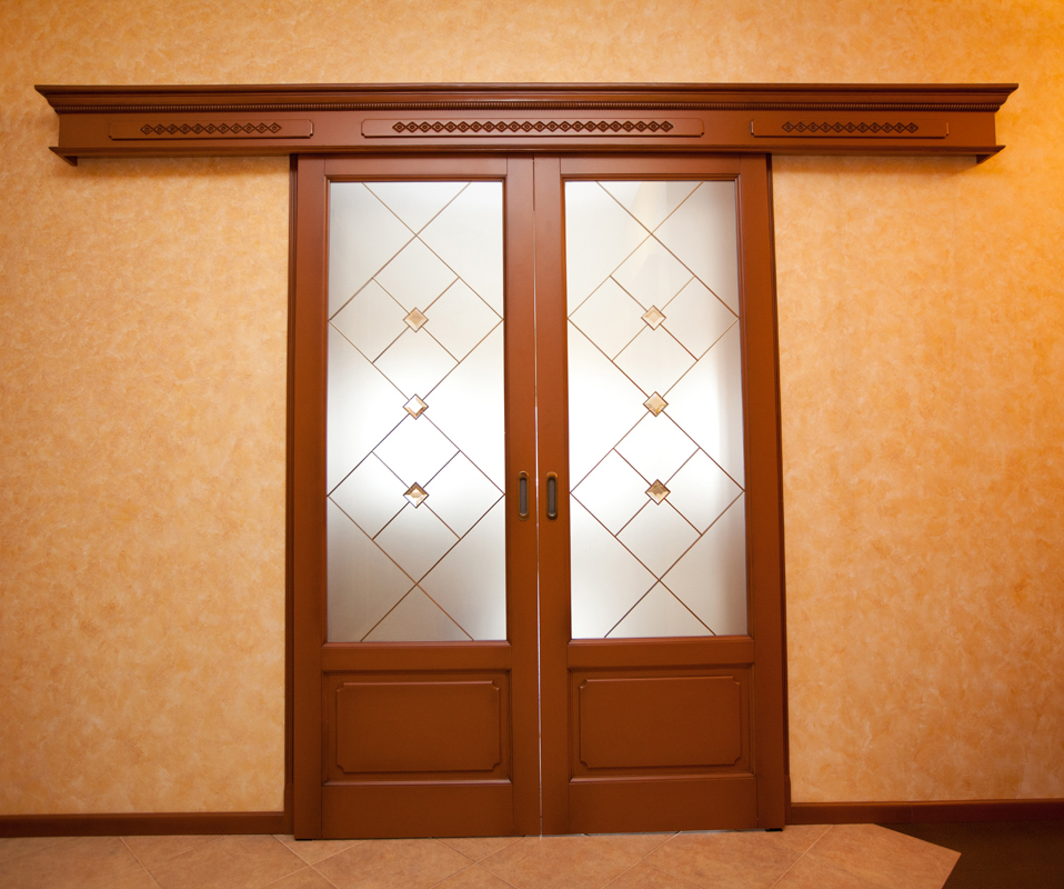 При изготовлении межкомнатных перегородок очень часто используются дверные рамы в виде полотна со стеклянными вставками, которые могут быть как цельными, так и выполненными в виде отдельных элементов, образующих определённую композицию. В качестве материала для деревянных рам чаще всего используются дуб, бук и шпонированная сосна с определённой цветовой тонировкой. В оформлении используется ярко выраженная древесная фактура, а в последнее время особенно популярными стали перегородки в японском стиле.
