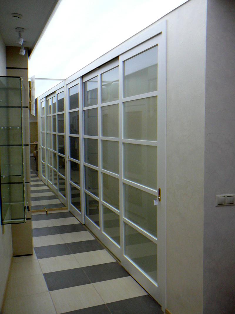 Раздвижной механизм состоит из направляющих и роликовых кареток, к которым крепятся полотна. В зависимости от модели количество полотен может быть разным. Направляющие перегородок изготавливаются из широких алюминиевых профилей, ролики делаются из полимера, устойчивого к постоянному трению. Для плавности хода используются подшипники качения.